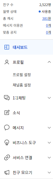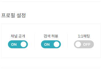이때 채널 대시보드로 이동하시어 채널 설정들을 진행해주셔야 채널 공개, 검색 허용, 1:1 채팅이 가능해집니다.