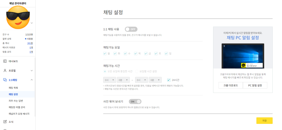 1:1채팅-채팅 설정으로 가시면 채팅이 가능한 시간을 설정하실 수 있습니다. 이때, 1:1 채팅이 오픈되어 있는 상태여야 하니 꼭 체크해주시구요.