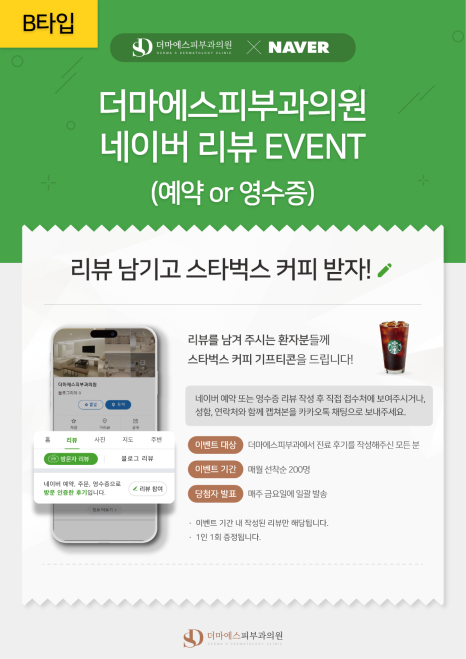 꿀팁으로 네이버 예약이나 영수증 리뷰 작성 시, 스타벅스 커피 쿠폰을 드린다고 원내에 디자인물을 비치하여 홍보를 하는 것인데요.