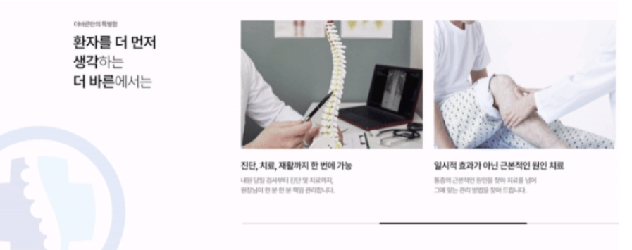 병원의 특별함은 3가지~5가지 정도로 핵심을 압축하여 옆으로 넘기는 모션으로 환자들에게 생동감 있게 전달할 수 있습니다.