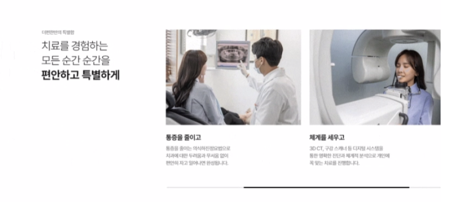 특별함은 3가지~5가지 정도로 핵심을 압축하여 옆으로 넘기는 모션 효과를 적용하여 환자들에게 생생하게 전달할 수 있습니다.