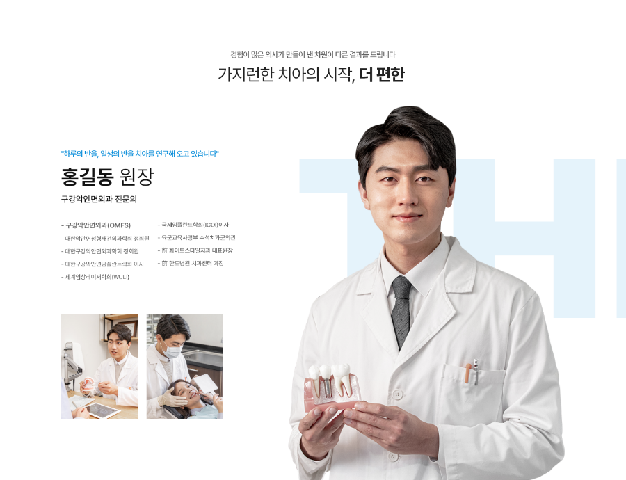 환자들은 홈페이지에서 내 소중한 몸을 치료할 원장님이 어떤 분인지 가장 궁금해 합니다. 따라서 프로필 섹션에는 원장님의 전문성과