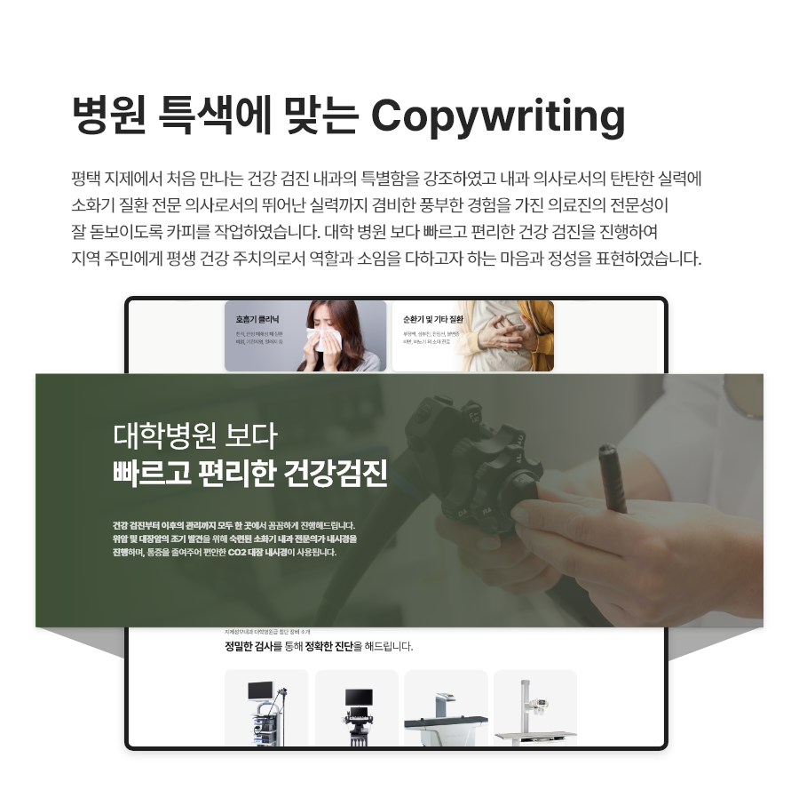 질환 전문 의사로서의 뛰어난 실력까지 겸비한 풍부한 경험을 가진 의료진의 전문성이 잘 돋보이도록 카피 작업을 했습니다.