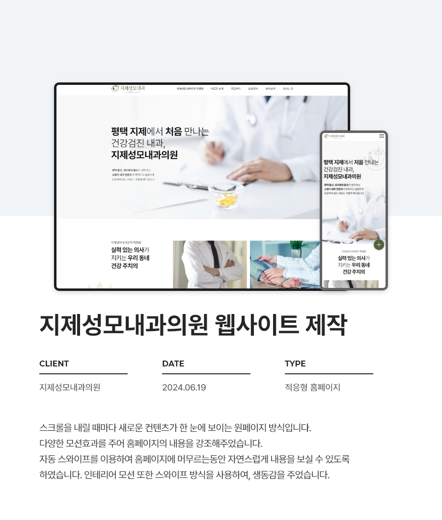 지제성모내과는 적응형 홈페이지로 PC, 모바일 여러 환경에서 홈페이지에 접속하는 이용자에게 동일한 경험을 제공하고, 가독성을
