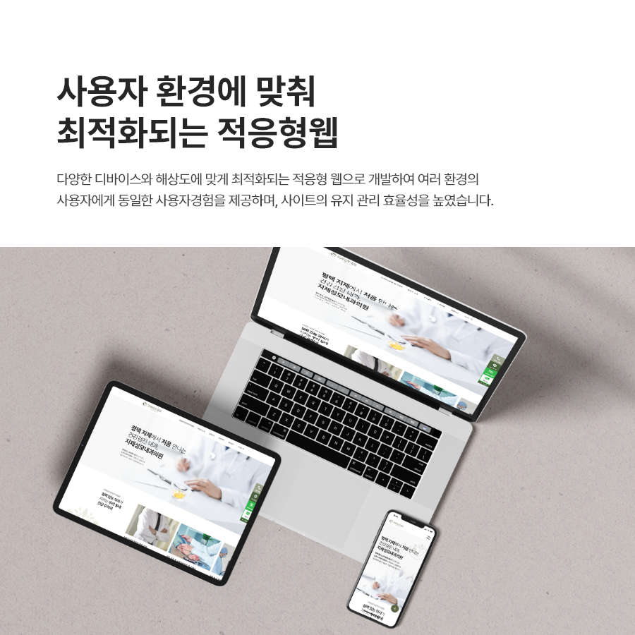 병원홈페이지는 가독성이 중요하게 때문에 다양한 디바이스와 해상도에 맞게 최적화되는 적응형 으로 개발했습니다. 반응형의 장점은
