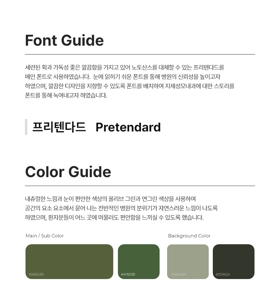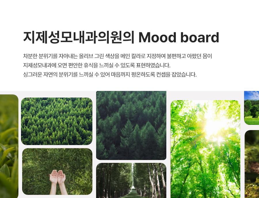 지제내과의 로고 색상인 올리브그린 계열을 메인으로 잡고 내추럴한 느낌과 눈이 편안한 색상의 올리브 그린과 연그린 색상을