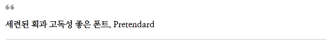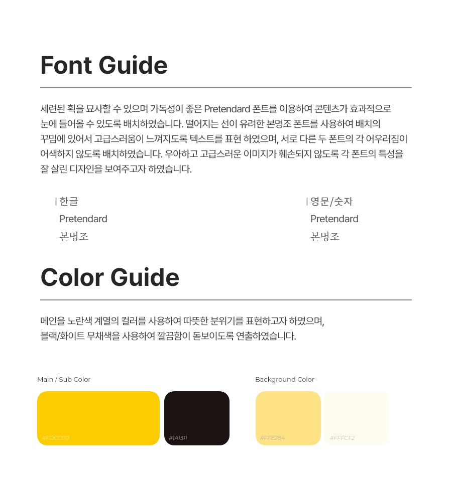 폰트는 Pretendard(프리텐다드)와 본명조 2가지를 사용하였습니다. 세련된 획을 묘사할 수 있으며 가독성이 좋은