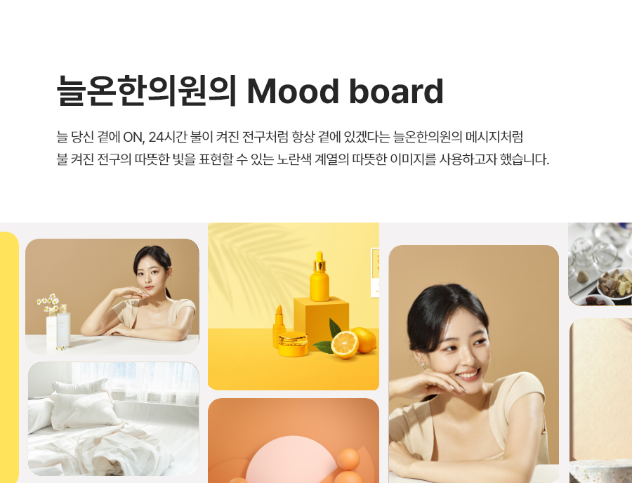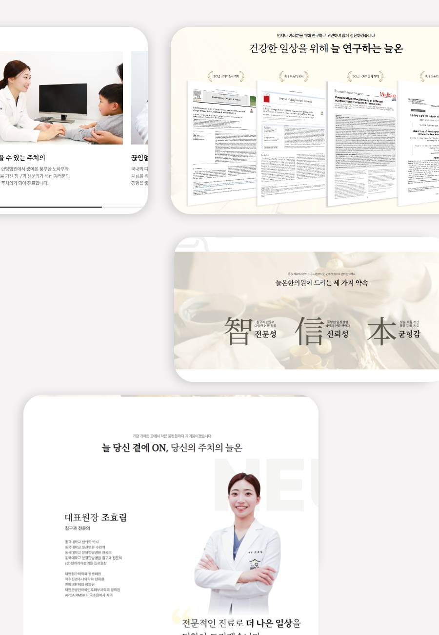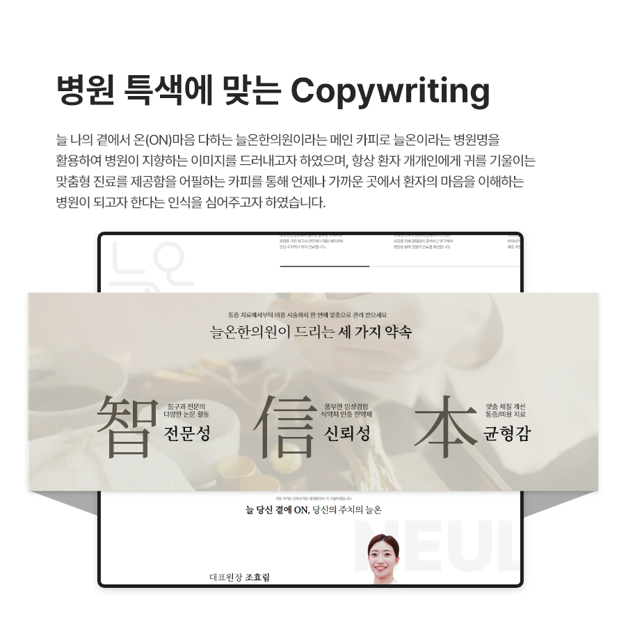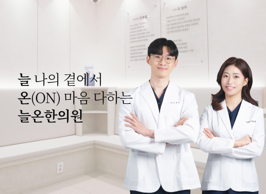 늘 나의 곁에서 온(ON) 마음 다하는 늘온한의원이라는 메인 카피로 늘온 병원명을 활용하였습니다. 병원이 지향하고자 하는 이미지를