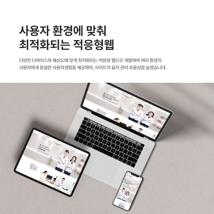 용인한의원홈페이지는 PC, 모바일 어느 기기에서 보아도 사용자에게 동일한 경험을 제공하는 것이 중요하기 때문에 다양한 디바이스와
