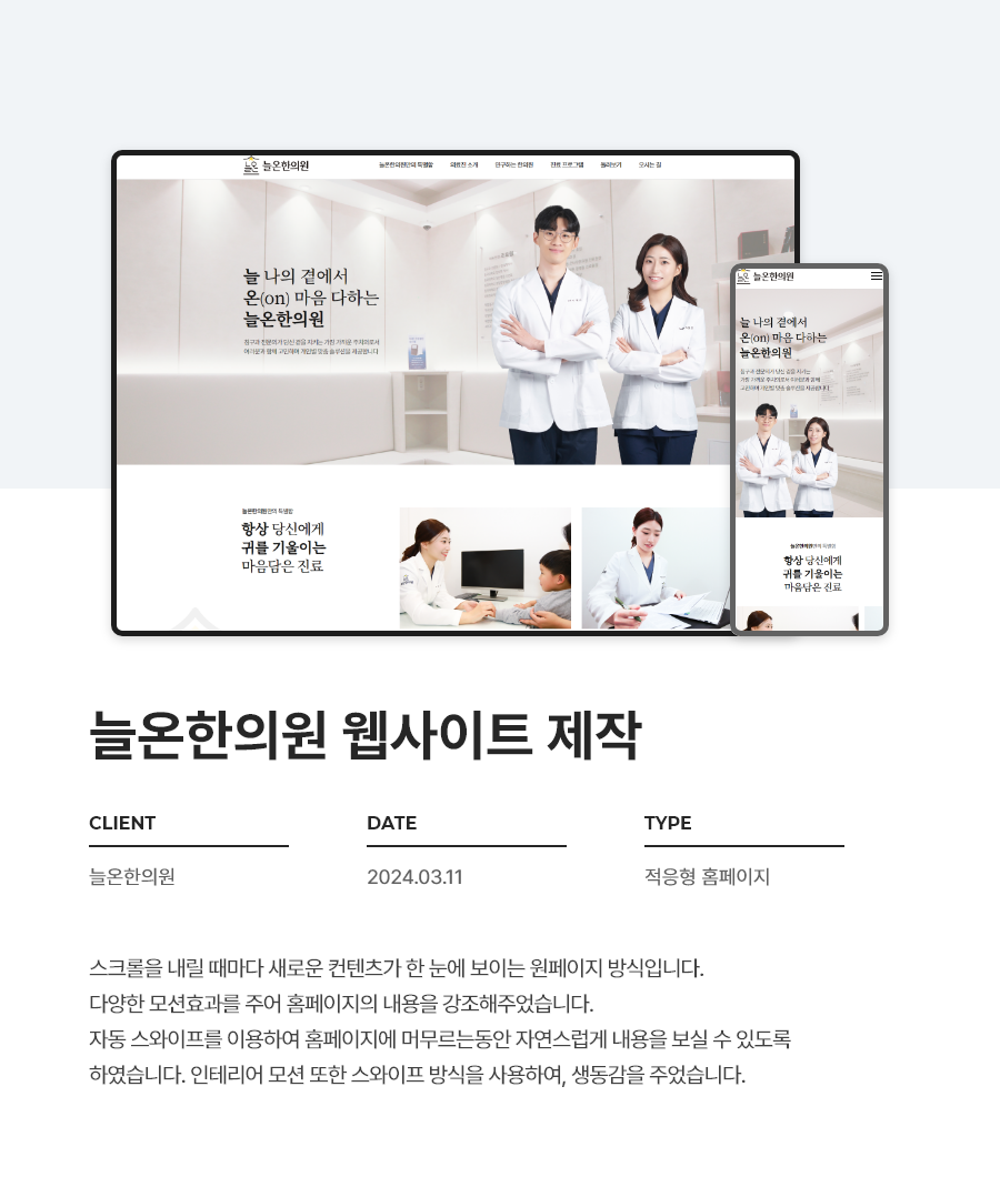 늘온한의원 홈페이지 완성본은 아래 링크에서 확인하실 수 있습니다.