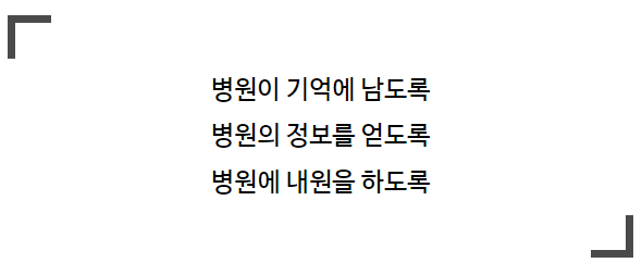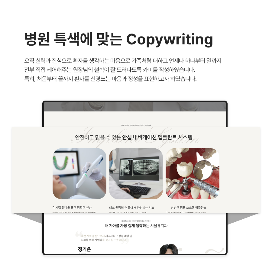 잘 드러나도록 카피 작업을 하였습니다. 특히, 처음부터 끝까지 환자를 신경 쓰는 마음과 정성이 잘 표현되도록 워딩 하나 하나