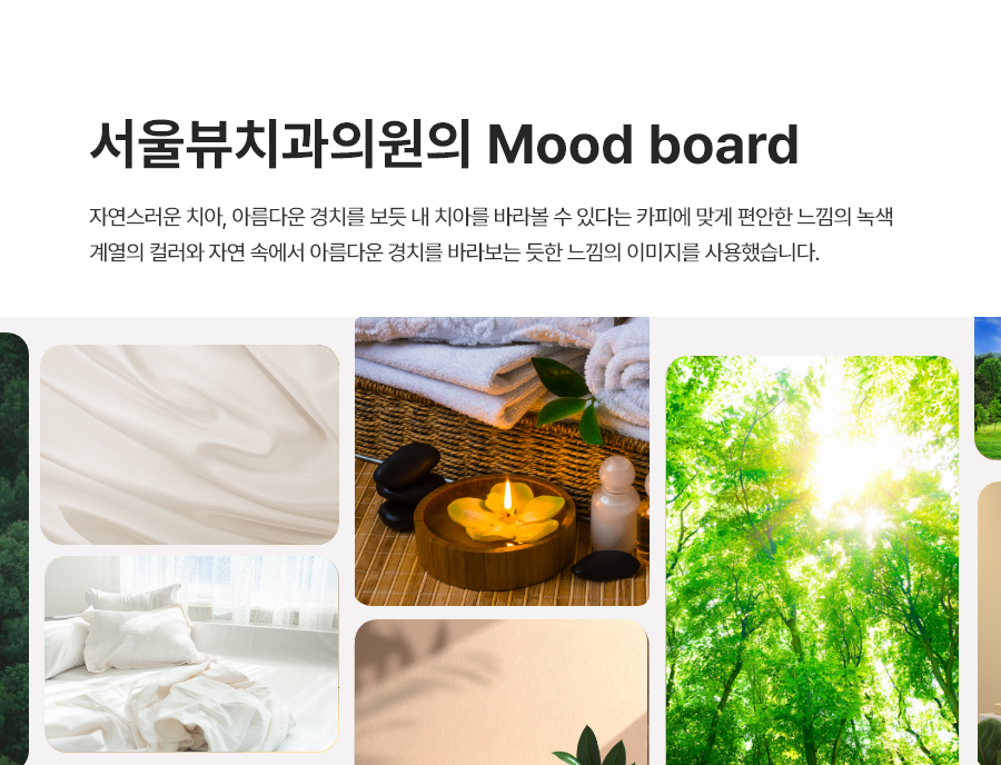 힐링 공간을 만들고자 하는 브랜딩 취지를 살려 타 치과와는 다른 독보적인 느낌을 주고자 했습니다.