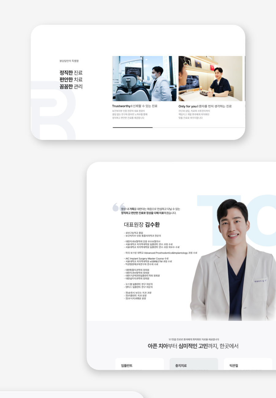 원장님께서는 많은 페이지가 있는 홈페이지 보다는 병원의 핵심 정보가 한 번에 잘 드러나고 간결한 것을 원하셨습니다. 요구사항에 맞추어