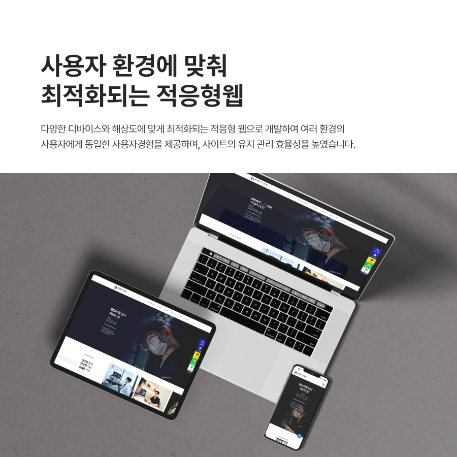 해당 홈페이지는 적응형으로 개발하여 다양한 디바이스와 해상도에 맞게 최적화하였습니다. 반응형으로 만드나요? 라고 질문을