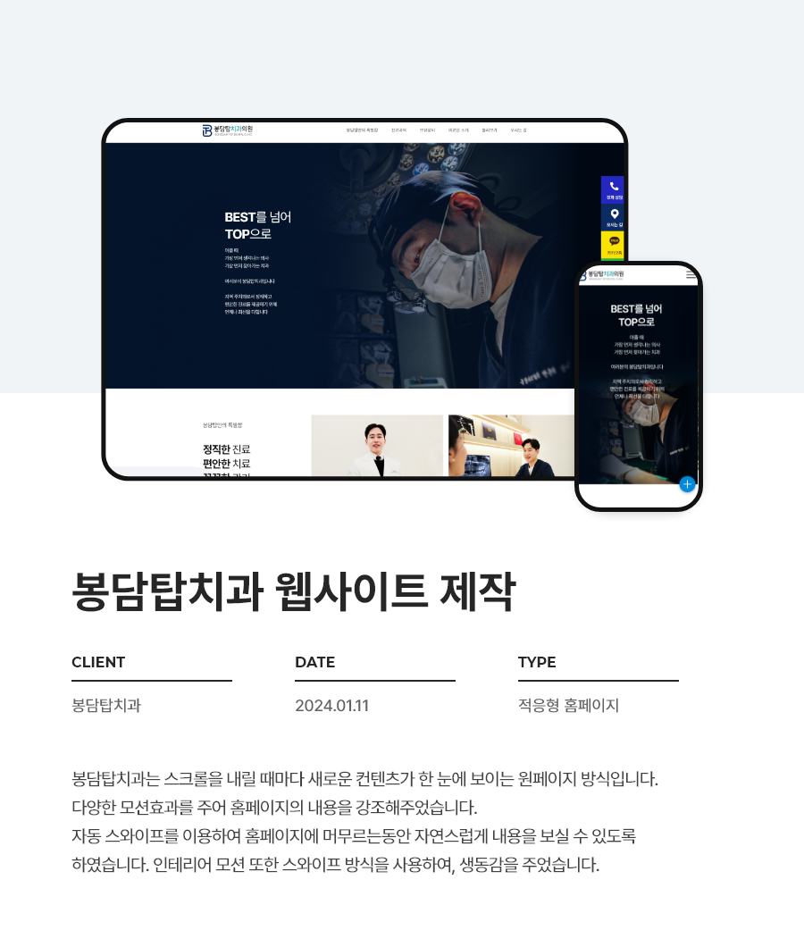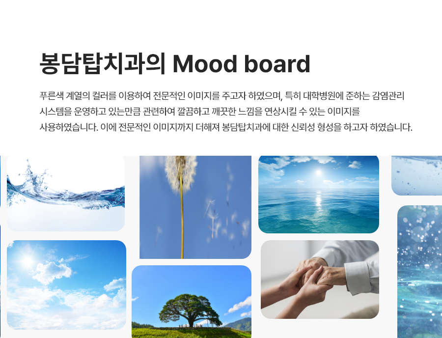 감염관리 시스템을 운영하고 있는 만큼 깔끔하고 안전한 느낌을 연상시킬 수 있는 이미지를 사용하였습니다. 봉담탑치과에 대한