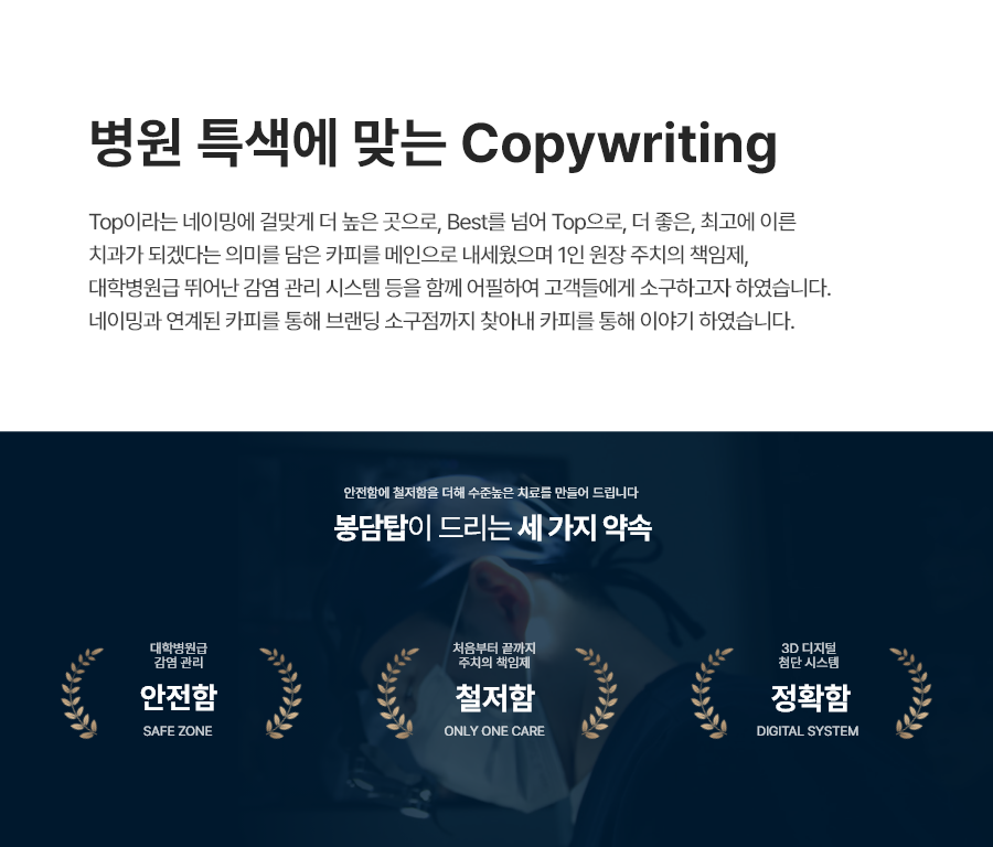 Top이라는 네이밍에 걸맞게 더 높은 곳으로, Best를 넘어 Top으로 더 좋은 치료에 이르게 한다는 치과의 의미를 담은 카피를 메인으로