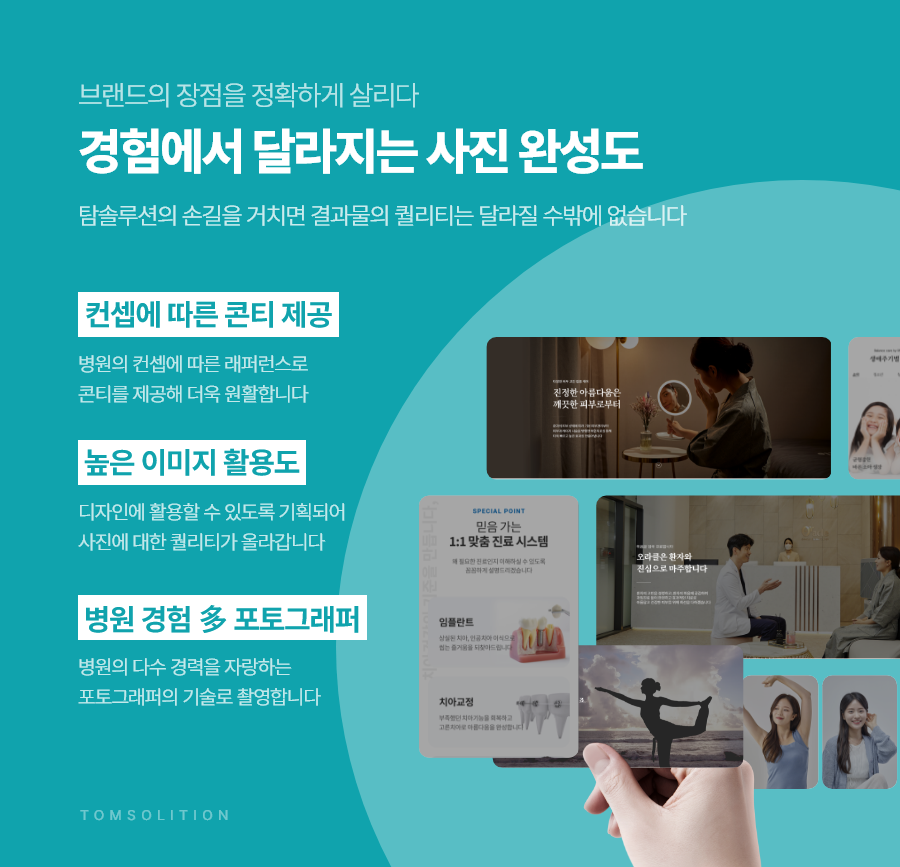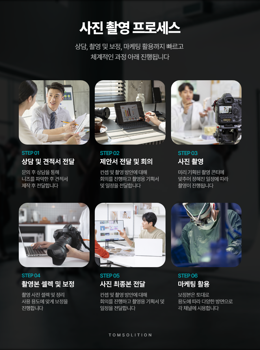 마케팅과 홈페이지에 다양하게 활용하며 홍보 효과를 높일 수 있는 사진 촬영, 궁금하시다면 언제든 저희 탐솔션으로 문의해 주세요.