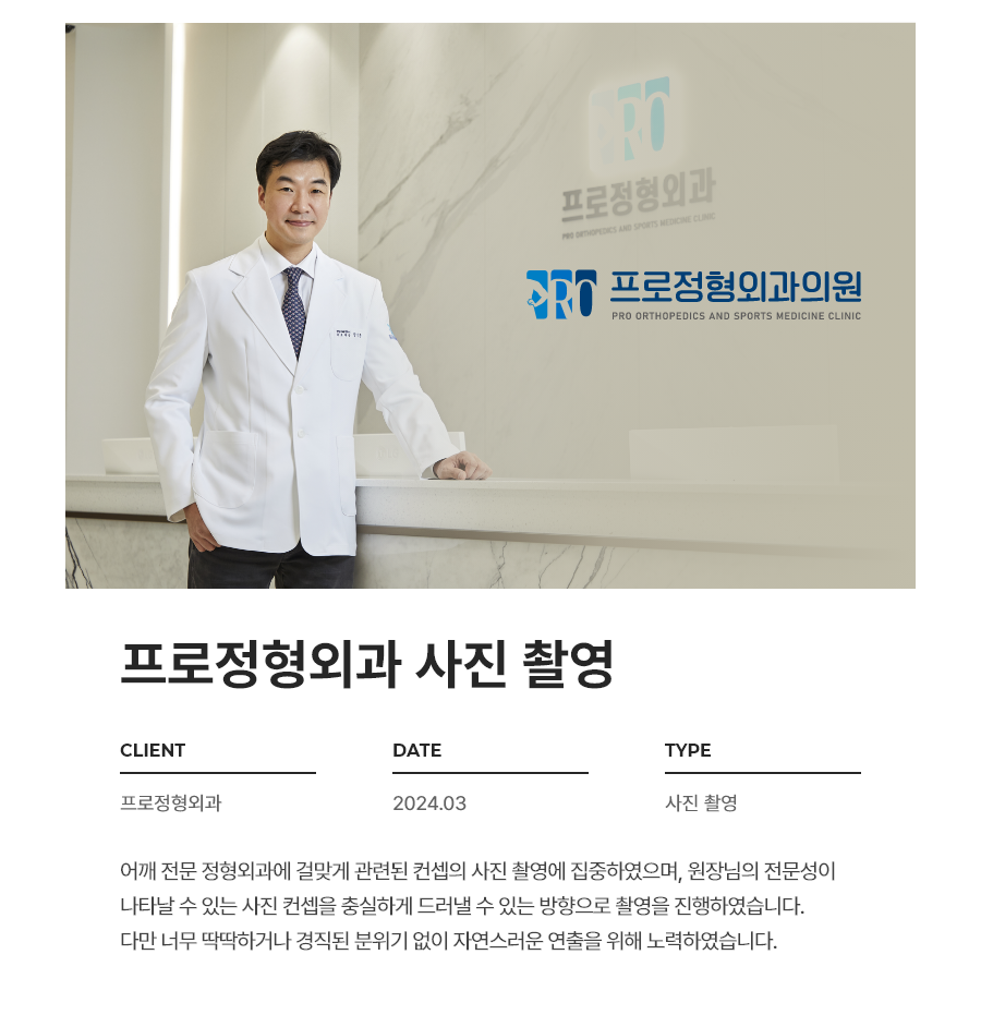안녕하세요 병원을 생각하는 마케팅 기업 탐솔루션입니다. 병원홍보사진촬영 차 프로정형외과에 다녀왔었는데요