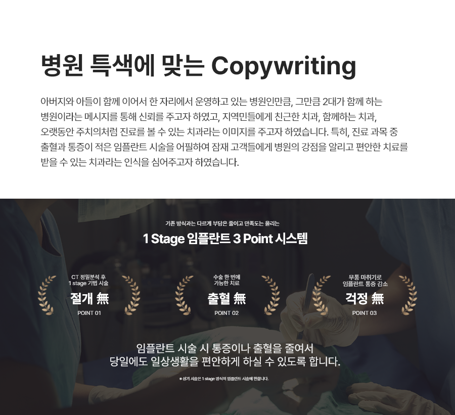 특히 진료 과목 중 출혈과 통증이 적은 임플란트 시술을 어필하여 잠재 고객들에게 병원의 강점을 살리고 편안한 치료를 받을 수 있는