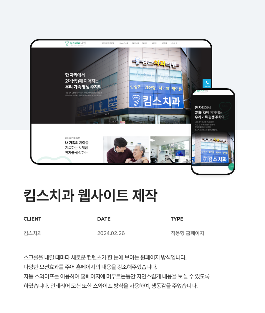 킴스치과 홈페이지 완성본은 아래 링크에서 확인하실 수 있습니다.