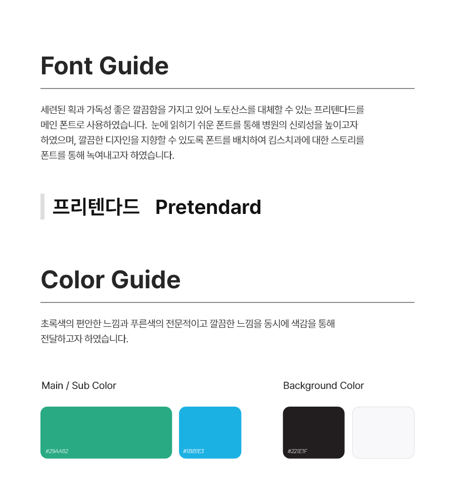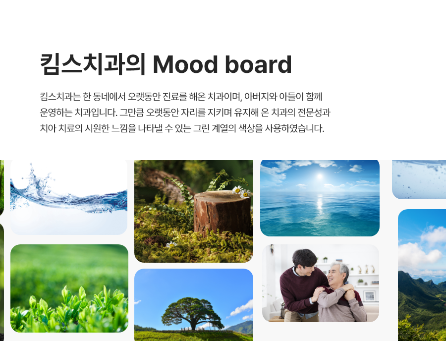 환자분들을 마치 내 가족과 같이 자연스럽고 친근하게 대한다는 느낌을 주고자 로고 색의 그린 계열을 메인 색상으로 사용하였습니다.