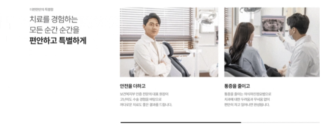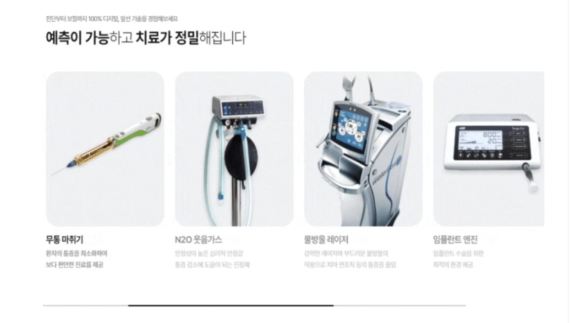 환자들에게 특히 부각되어야 할 내용 중 '병원의 특별한 점', '장비 소개'와 같은 섹션은 이미지를 여러 개로 나누어 자동 스와이프를