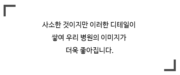 언제나 환자의 입장에서 먼저 생각한다면 안 보이던 것이 보이고, 환자들에게 우리 병원의 이미지를 긍정적으로 전달할 수 있습니다.
