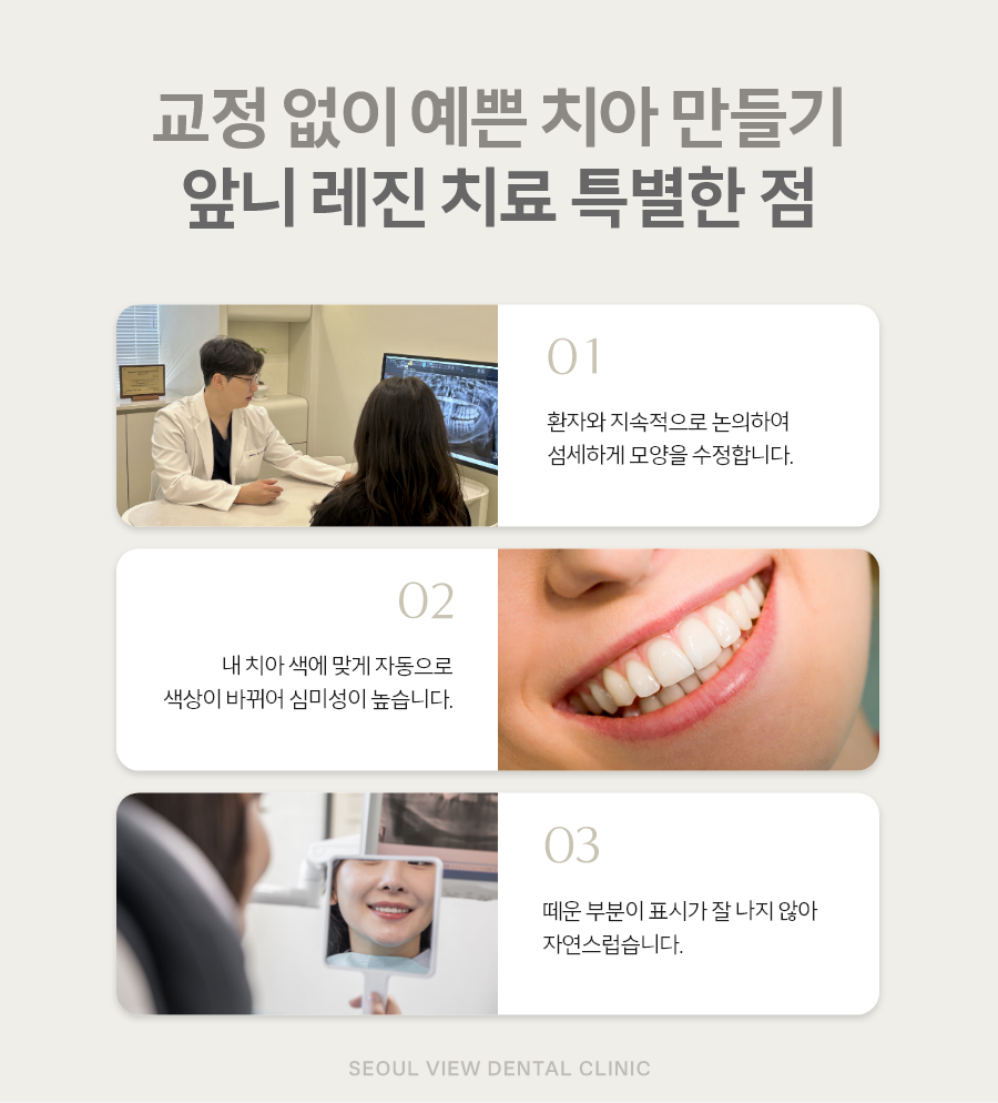 교정 없이 레진 치료로 빠르고 편한게 라는 메시지를 전달하기 위해서 좋은 재료의 레진을 통해서 환자분과 충분한 상담을 통해서
