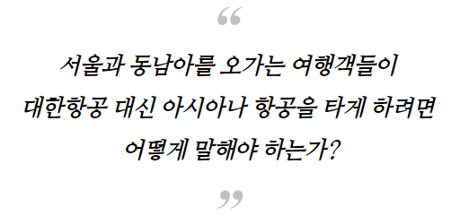 그런데 질문이 잘못되었습니다. 다시 아시아나 항공 이야기로 돌아와볼까요? "대한항공 대신 아시아나 항공을 선택해야