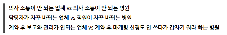 병원과 마케팅 업체는 한 배를 탄 운명 공동체라고 생각하셔야 합니다. 그런데 서로 이야기 하지 않으면 무엇을 원하는지 조차