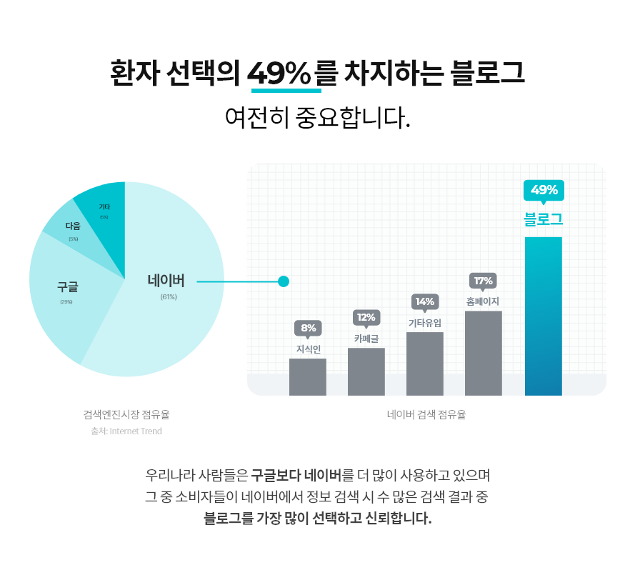 환자들은 병원에 대한 정보를 탐색할 때 짧게 보고 휘발되는 영상이 아니라 일단 네이버에서 검색하고 블로그, 스마트 플레이스,