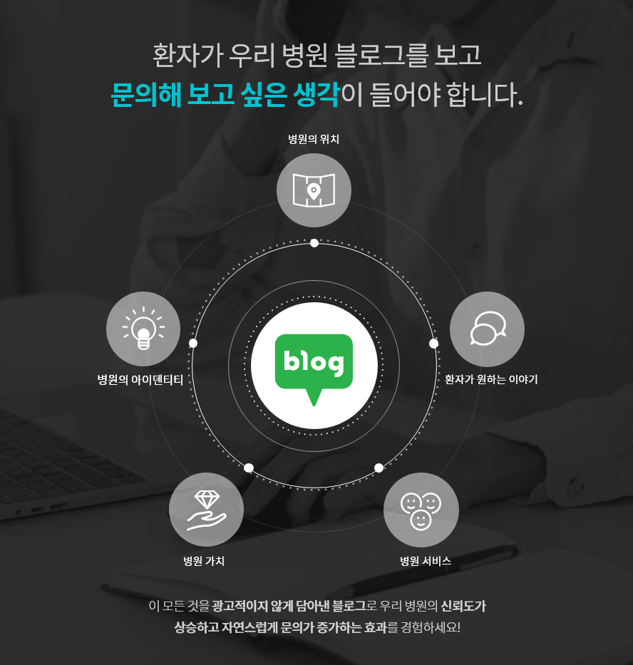 제일 잘 아실 테니까요. 그 지만 병원 운영만으로도 시간이 부족하시고 블로그 마케팅까지 신경 쓰실 여력이 없으실 텐데요.