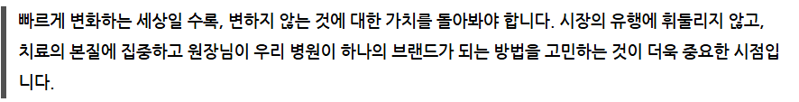시장 흐름과 필요에 따라 병원의 운영 전략을 탄력적으로 변화시켜야 하는데 쉽지는 않습니다. 지역을 확실하게