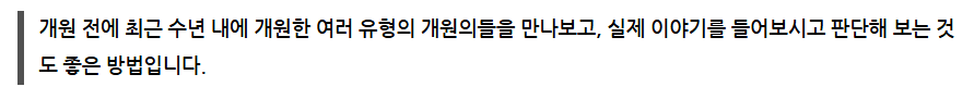 개원을 사업이라는 관점에서 보면 본인이 어떤 성향인지 중요합니다. 사업을 하려는 사람들은 대부분 독립적이고