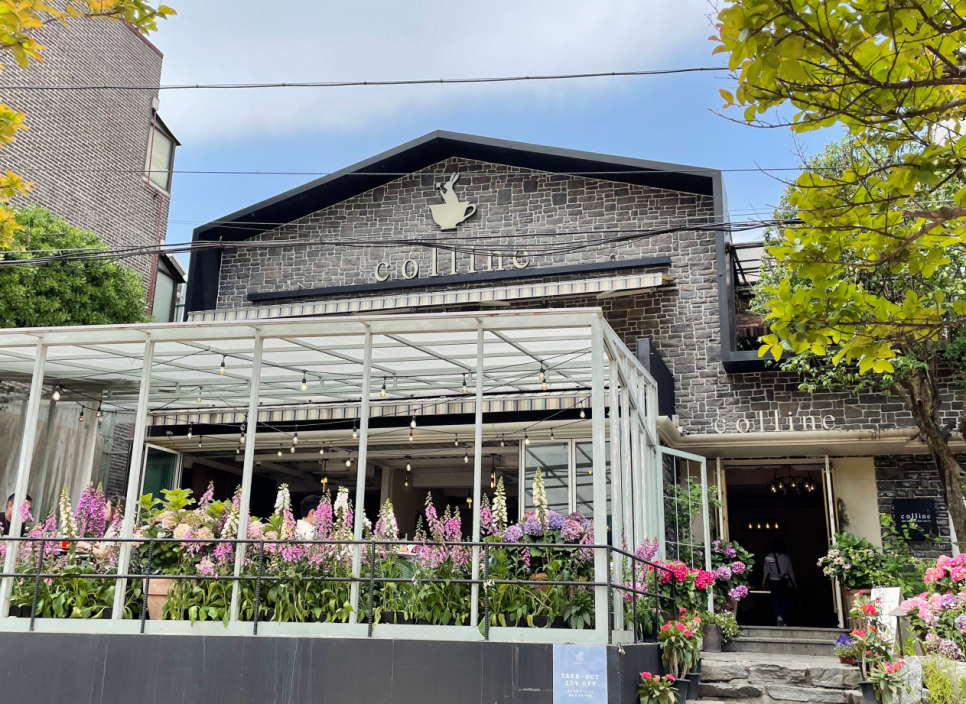멋졌습니다. 건물이 1, 2층으로 구성되어 있는데 각 테이블마다 작은 화병에 생화가 꽂혀 있습니다. 보통 카페 가면 관리와 비용의