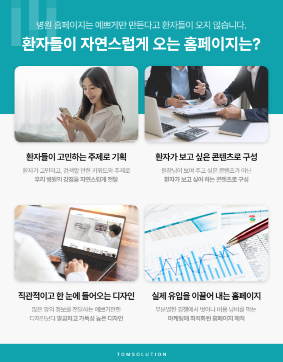 우리 병원의 강점을 잘 정리한 내용이 있다면, 이를 한눈에 각인이 되도록 잘 디자인하는 일이 중요합니다. 내용과 가장 잘 어울리고