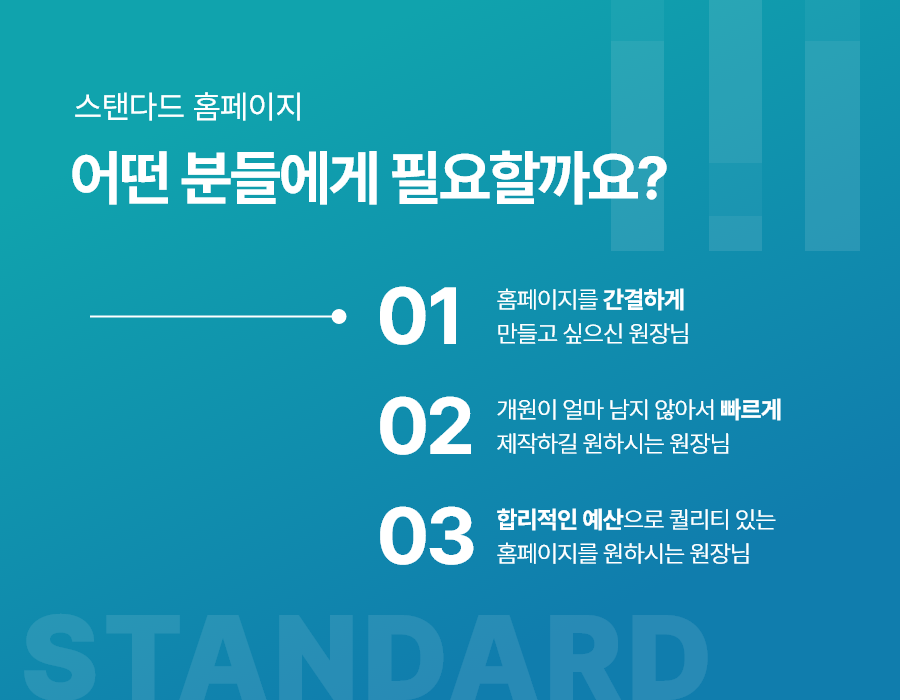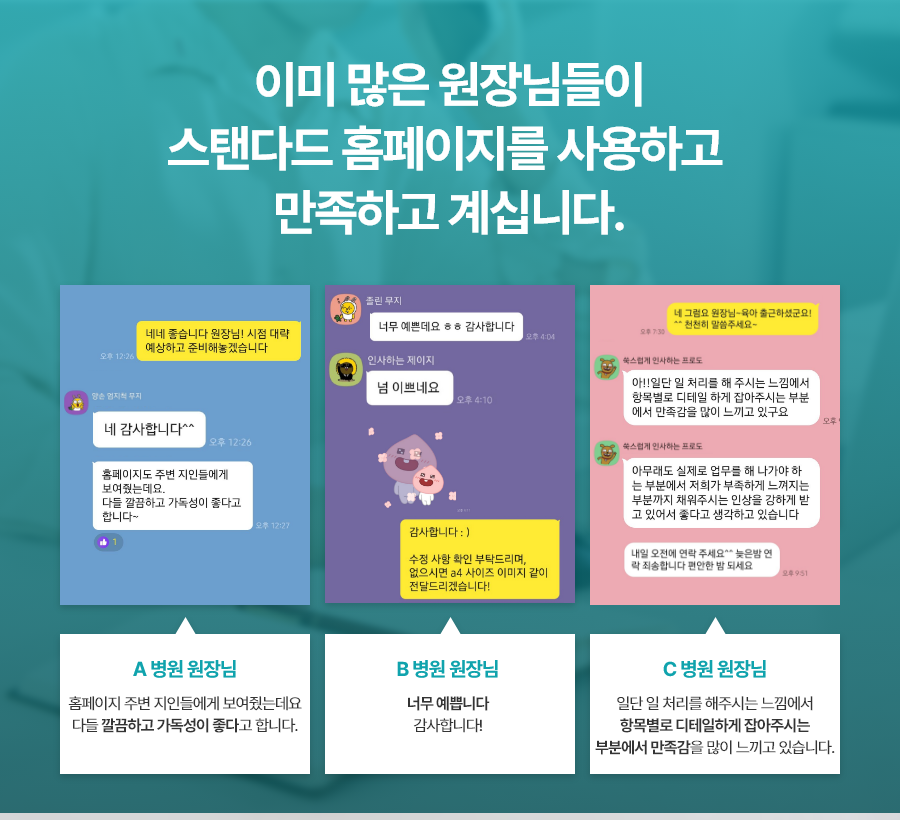 1인 원장님 병원에 특화된 스탠다드 홈페이지를 제작해 드리고 있습니다. 스탠다드 홈페이지는 1페이지 홈페이지입니다.