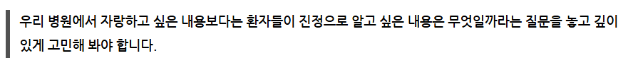 내가 환자라고 생각하고 걱정을 없애줄 수 있는 콘텐츠를 만들어야 합니다. 홈페이지에 오면 불안이 안심으로 바뀌고, 믿고 맡길 수