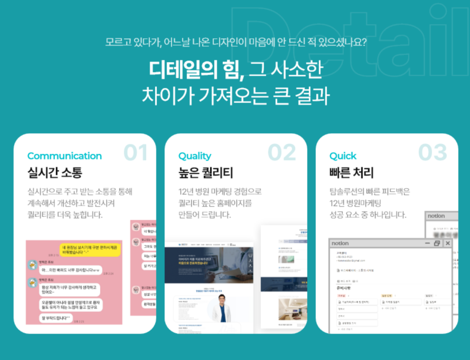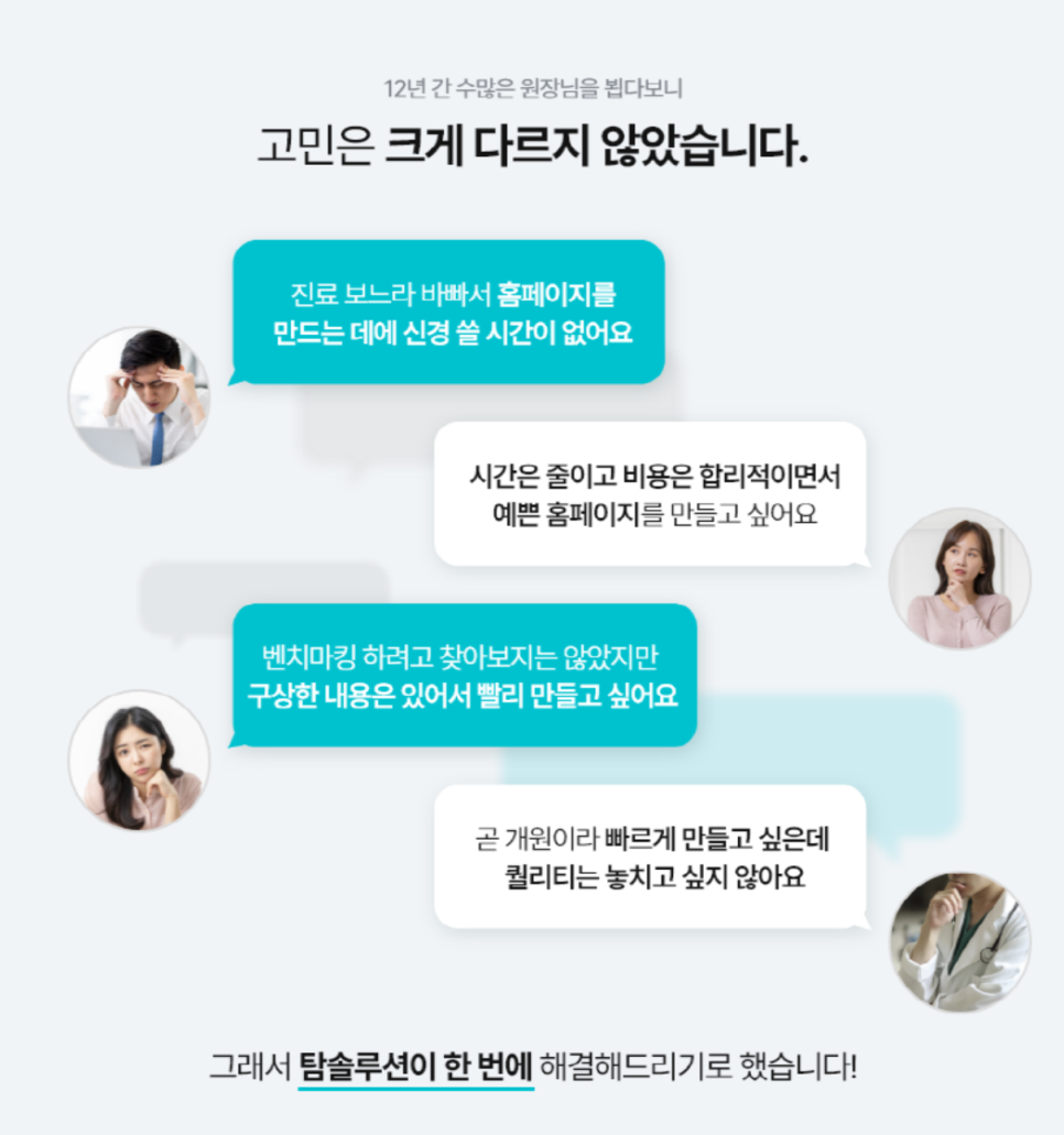 병원의 이미지까지 퀄리티가 낮아 보이는 것이죠. 그래서 저희 탐솔루션은 병원 홈페이지 제작을 위해서 깊이 있는 질문지를 통한