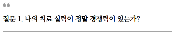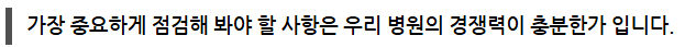 전략을 만들어 낸다면 우리의 경쟁력은 상대적으로 낮아질 수 있습니다. 우리 병원이 잘하는 치료와 특별한 서비스, 주력 진료