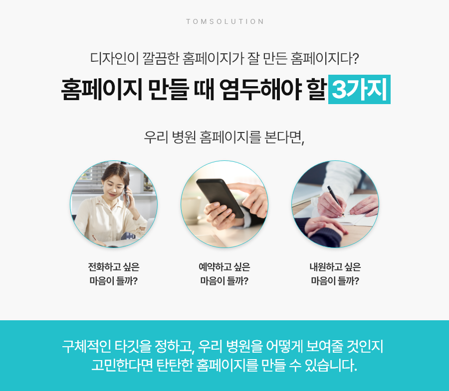 저희 탐솔루션은 단순하게 홈페이지를 제작하지 않습니다. 환자의 심리, 병원의 강점, 지역 특성까지 고려한 전략적 기획을 통해