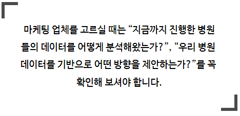 실질적인 성과를 만들어낼 수 있는 병원마케팅대행사를 고르는 일은 그 무엇보다 중요합니다.