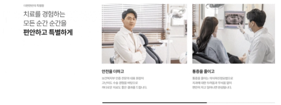 구체화하여 보여줍니다. 여기에 좌우로 넘기는 모션이나 스크롤 시 전환 효과를 활용해 방문자의 시선을 집중시키고, 병원의