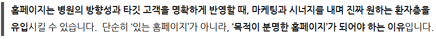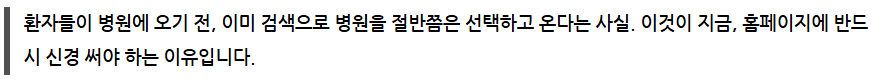 따라서 진료를 잘하는 것만큼, 그 진료가 환자에게 닿을 수 있도록 온라인 상에서 구조화되어 있는지 점검해 보셔야 합니다.