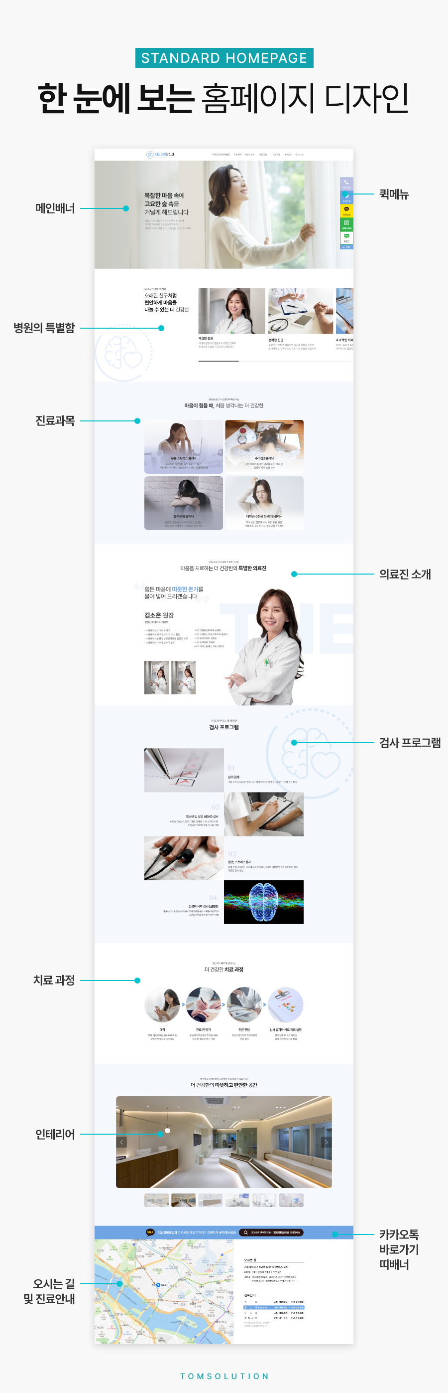 스탠다드 홈페이지는 단 하나의 페이지로 구성되며, 총 8개의 섹션으로 병원의 이야기를 풀어나갑니다. 이 8개 섹션은 사용자가