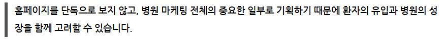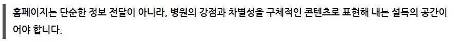 이런 핵심 질문에 설득력 있게 답해주는 콘텐츠가 없다면, 아무리 디자인이 예뻐도 환자는 쉽게 이탈하게 됩니다. 따라서