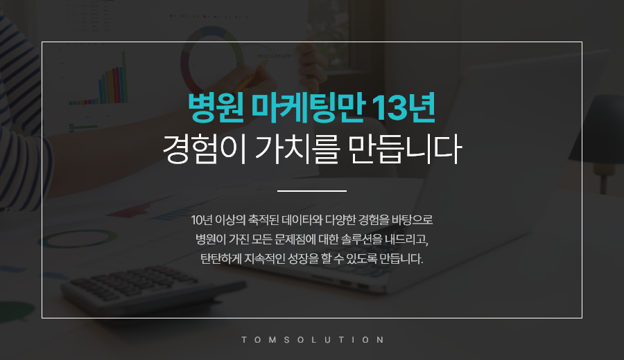 탐솔루션은 14년 동안 병원만을 전문으로 마케팅해 온 회사입니다. 홈페이지, 콘텐츠, 키워드, 사진 촬영, 환자 응대 프로세스까지