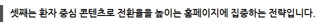 합니다. 이를 위해 병원에서는 강조하고 싶은 진료 항목이나 특장점을 선별하고, 그에 맞는 콘텐츠를 의료법 기준에 맞춰 기획한 뒤