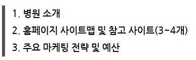 처음 상담할 때 구체적인 기획 문서는 없어도 됩니다. 다만, 아래의 항목들을 고민해 보고 미리 준비한다면 업체에게 우리 병원의