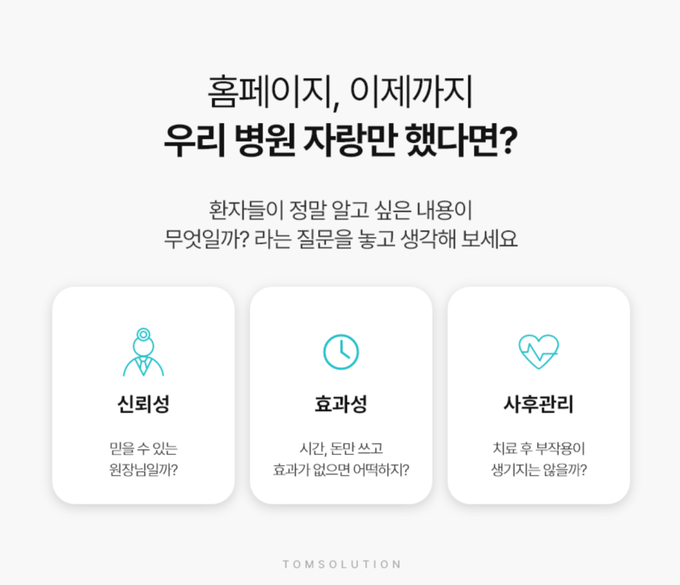 미리 알려 주세요. 원장님이 바라고 원하던 홈페이지를 만나실 수 있을 것입니다. 저희 탐솔루션에서 제작한 홈페이지가